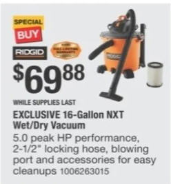 RIDGID 16 Gallon 5.0 Peak HP NXT Wet/Dry Shop Vacuum w/Filter, Locking Hose and Accessories
