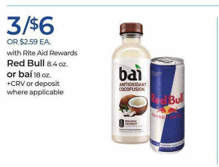 Red Bull 8.4 oz or bai: 3/$6