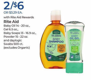 Rite Aid Baby Oil 14-20 oz., Gel 6.5 oz., Baby Soaps 13 - 16.9 oz., Powder 15- 22 oz. and daylogic Swabs 500ct.(excludes Organic) 2/$6 or $3.29 each