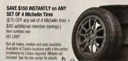 SAVE $150 INSTANTLY ON ANY SET OF 4 Michelin Tires($70 off any set of 4 Michelin tires+$80 additionla member savings.)