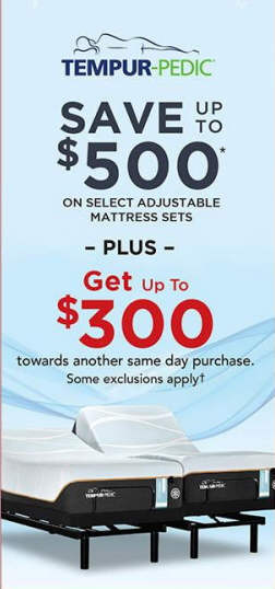 SAVE UP TO $500 ON SELECT ADJUSTABLE MATTRESS SETS. Get Up To $300 towards another same day purchase.Some exclusions apply