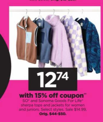 SO and Sonoma Goods For Life Sherpa Tops And Jackets For Women And Juniors (15% off coupon)