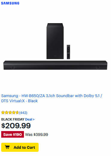 Samsung - HW-B650/ZA 3.1ch Soundbar with Dolby 5.1 / DTS Virtual:X - Black