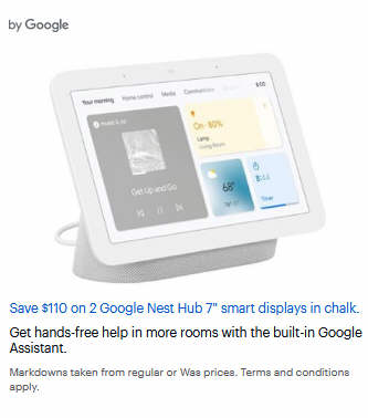 Save $110 on 2 Google Nest Hub 7" smart displays in chalk.