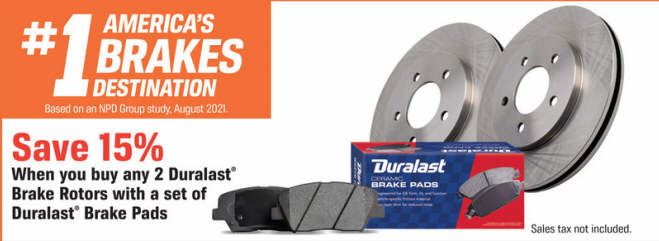 Save 15% when you buy any 2 Duralast Brake Rotors with a set of Duralast Brake Pads