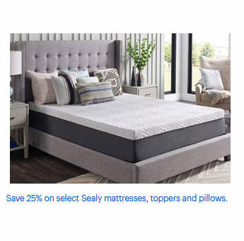 Save 25% on select Sealy mattresses, toppers and pillows.