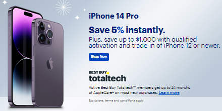 Save 5% instantly. Plus, save up to $1,000 with qualified activation and trade-in of iPhone 12 or newer