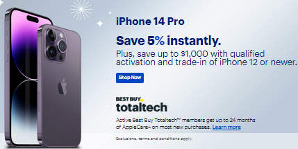 Save 5% on iPhone 14 Pro instantly + Plus, save up to $1,000 with qualified activation and trade-in of iPhone 12 or newer