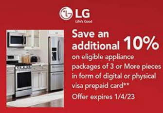 Save an additional 10% on eligible appliance packages of 3 or More pieces in form of digital or physical visa prepaid card