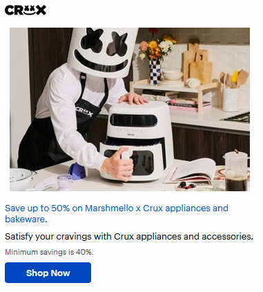 Save up to 50% on Marshmello x Crux appliances and bakeware.