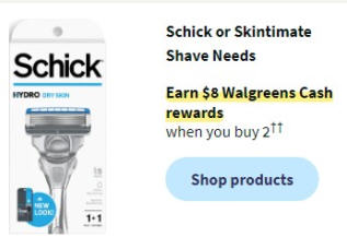 Schick or Skintimate Shave Needs Earn $8 Walgreens Cash rewards when you buy 2