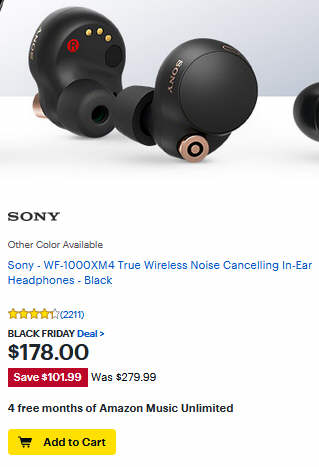 Sony - WF-1000XM4 True Wireless Noise Cancelling In-Ear Headphones - Black