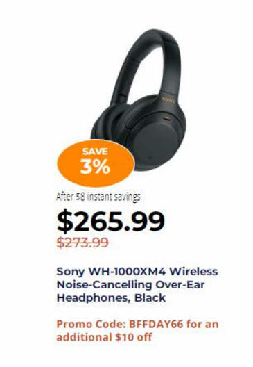 Sony WH-1000XM4 Wireless Noise-Cancelling Over-Ear Headphones, Black $265.99 via Promo Code: BFFDAY66