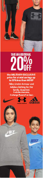 TAKE AN ADDITIONAL 20% OFF the MILITARY-EXCLUSIVE price for a total savings up to 35% less than MSRP.Nike, Under Armour and Adidas clothing for the family.