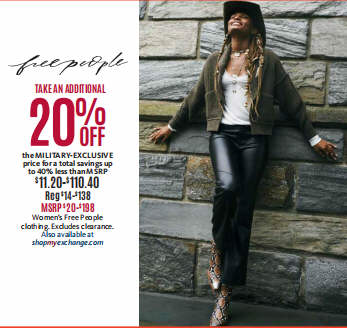 TAKE AN ADDITIONAL 20% OFF the MILITARY-EXCLUSIVE price for a total savings up to 40% less than MSRP Women s Free People clothing. Excludes clearance.