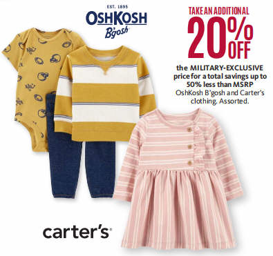 TAKE AN ADDITIONAL 20% OFF the MILITARY-EXCLUSIVE price for a total savings up to 50% less than MSRP OshKosh B gosh and Carter s clothing.