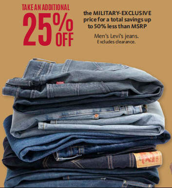 TAKE AN ADDITIONAL 25% OFF the MILITARY-EXCLUSIVE price for a total savings up to 50% less than MSRP. Men s Levi s jeans.Excludes clearance.