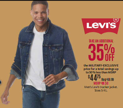 TAKE AN ADDITIONAL 35% OFF the MILITARY-EXCLUSIVE price for a total savings up to 50% less than MSRP. Men s Levi s trucker jacket. Sizes S-XL.