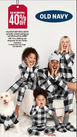 TAKE AN ADDITIONAL 40% OFF the MILITARY-EXCLUSIVE price for a total savings up to 50% less than MSRP. Old Navy clothing and sleepwear for the family.