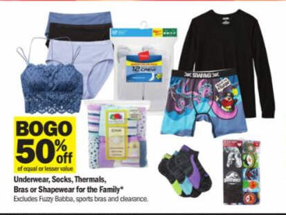 Underwear, Socks, Thermals, Bras or Shapewear for the Family: BOGO of equal or lesser value 50% off