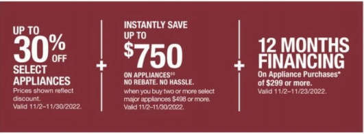 Up to 30% off Select Appliances + Instantly Save up to $750 + 12-month Financing on Appliance Purchase of $299 or More