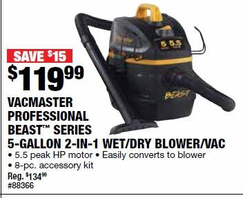 Vacmaster Professional Beast Series 2-in-1 Wet/Dry Blower/Vac - 5 Gallon, 5.5 Peak HP, Model# VFB511B 0201