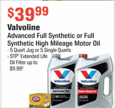 Valvoline Advanced Full Synthetic or Full Synthetic High Mileage Motor Oil