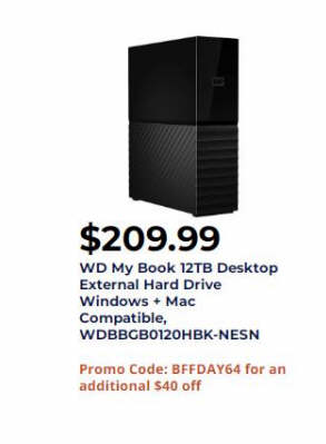 WD My Book 12TB Desktop External Hard Drive Windows + Mac Compatible, WDBBGB0120HBK-NESN $209.99 via coupon BFFDAY64