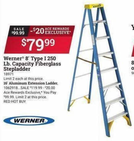 Werner 8 ft. H Fiberglass Step Ladder Type I 250 lb. capacity, with $20 ace rewards card
