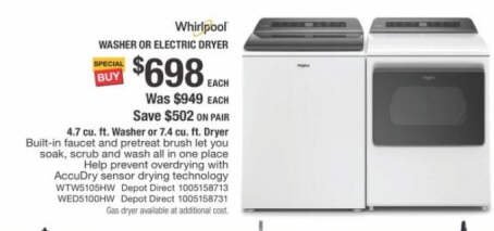 Whirlpool 4.7 cu. ft. Top Load Washer with Agitator, Adaptive Wash Technology, Quick Wash Cycle and Pretreat Station in White for $698 each when you buy a pair