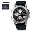 This Casio Waveceptor Atomic timepiece is equipped with a precise Casio Japanese Quartz Movement encased in a 42mm (1.65") brushed solid silvertone stainless steel case and screwdown caseback. A scratch resistant hardened mineral crystal protects the jet-black dial which contains luminous silvertone hands and luminous silvertone hour markers. The dial also boasts a digital date display window located at the 4:00 hour position, complete with an automatically adjusting calendar pre-programmed through the year 2099! Contrasting black, white and red chronograph subdials are located at the 12:00-6:00-9:00 hour positions measuring 1/10th-second, 24-hours and 60-minutes. This watch is loaded with all sorts of other useful functions as well! It has an alarm mode, a daylight savings time on/off feature, a full auto LED backlight, a dual-time mode and a 29 time-zone mode. There's even a tachymeter scale along the inner-bezel of the brushed solid silvertone stainless steel bezel! The strap is crafted from soft grooved black rubber and it fastens with a solid stainless steel pin-buckle clasp. This Casio Waveceptor watch also boasts water resistance to 100 meters (330 feet - 10 ATM).