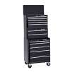 Tool storage collection with a 7 drawer chest (59778), 5 drawer roll away (59779) and a 2 drawer intermediate chest (59889). All items feature black baked enamel shell and drawers with silver trim, aluminum drawer pulls, and compound-action drawer slides.