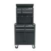 Craftsman Tool Center has platinum shell and black drawers, with full width aluminum drawer trim, full extension drawers w/ compound action drawer slides and external lock bar with reversible, overmolded keys., three small parts bins, riser and bulk storage panel. 4 x 2 in. casters provide a 500 lb. Load rating. Provides 12, 573 cubic inches of storage. Measures 26-1/2W x 14D x 55H.