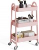 3-Tier OLIXIS Utility Rolling Cart, Metal Mobile Storage Shelf with Lockable Caster Wheels (Pink)